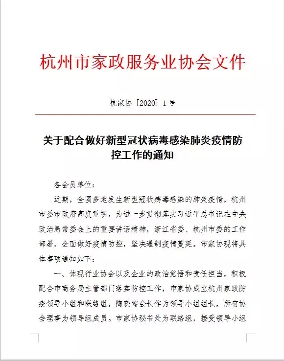 杭州市家協(xié)于1月28日成立了杭州家政防疫領(lǐng)導(dǎo)小組和聯(lián)絡(luò)組,積極配合市商務(wù)局主管部門落實(shí)防控工作,并要求會員企業(yè)做好健康情況自查統(tǒng)計。